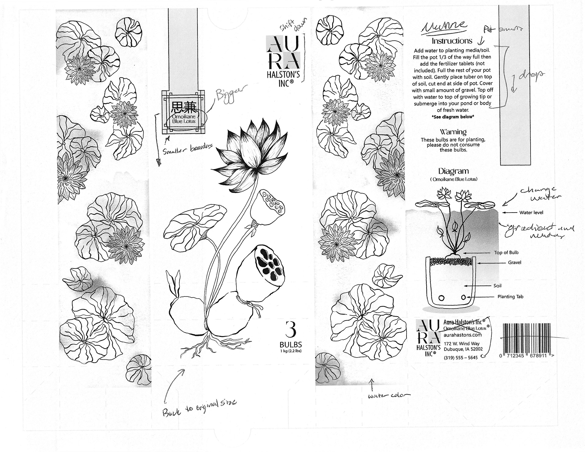 There were some things that I added in this stage that I liked and there were some that I didn't like at all. The scanner doesn't like the watercolor on the sides so it looks like it is missing which is not the case. I added the shading onto the lotus which felt to heavy. The gradient in the pot felt better than the gradient I had before. I also did a water like of water lines verses the gradient that I had before which looked weird. I needed to figure out the front tag more as well.